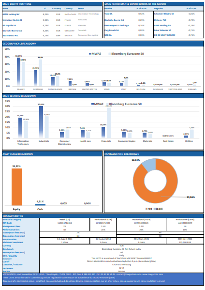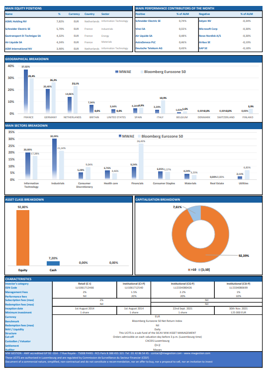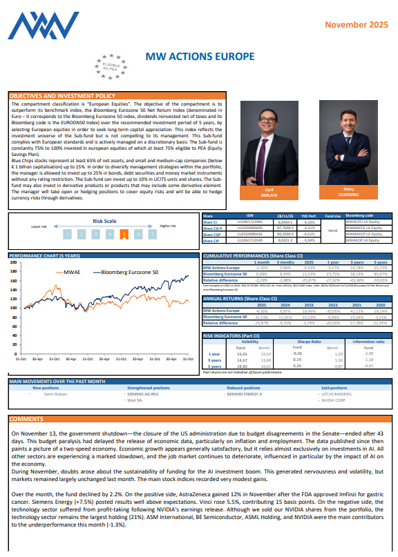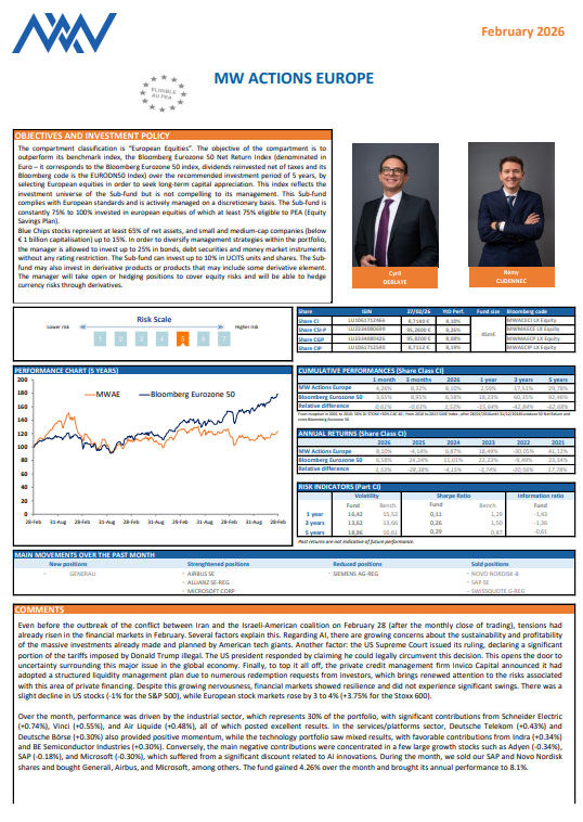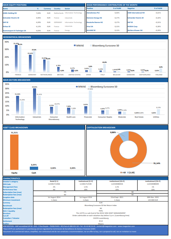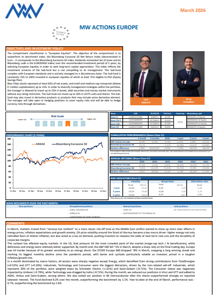 The MW Actions Europe fund of the Luxembourg SICAV MW ASSET MANAGEMENT is actively managed according to its benchmark, but this does not imply any constraints on the composition of the portfolio, which is left to the fund manager’s discretion. The fund invests at least 65% minimum of its AUM in larger companies (market capitalization of over 1 billion euros) and could invest up to 15% in small & mid-caps.