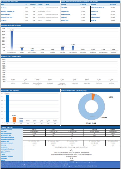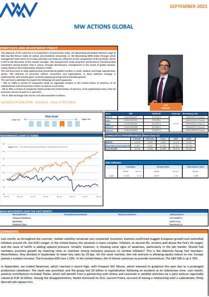 The MW Actions Global sub-fund of the Luxembourg Sicav MW ASSET MANAGEMENT is invested in global equities, mainly listed on the US markets (70%), with the aim of outperforming its benchmark index, MSCI World (in dollars and dividends reinvested), through active management.